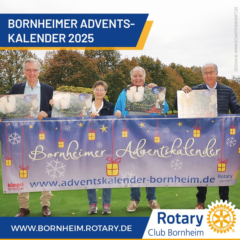 Zur Unterstützung der Projekte kann neben dem Kauf des Adventskalenders auch direkt gespendet werden an den Verein der Freunde des Rotary Clubs Bornheim e.V. IBAN: DE24 3705 0299 0051 0001 56; Verwendungszweck „Adventskalender“.